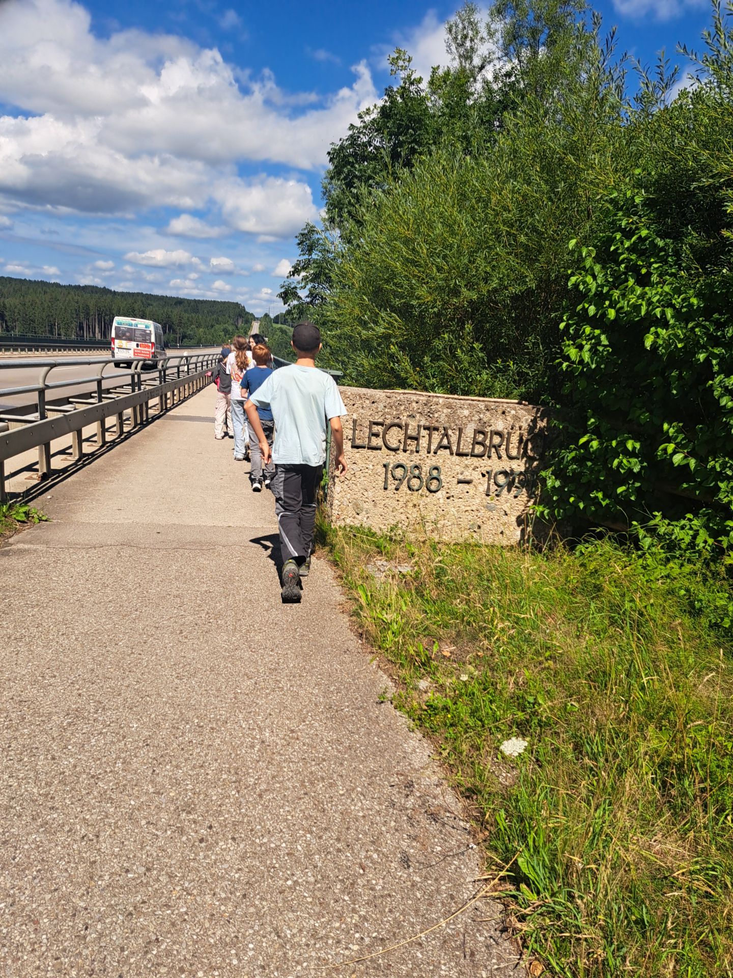 Am Ende des Schuljahrs machten sich unsere Forscherklassen 6a, 6e und 6d auf den Weg zur Lechtalbrücke. Nach einer längeren Wanderung durch den Wald erreichten wir das Widerlager der Brücke – und dort begann das eigentliche Abenteuer.