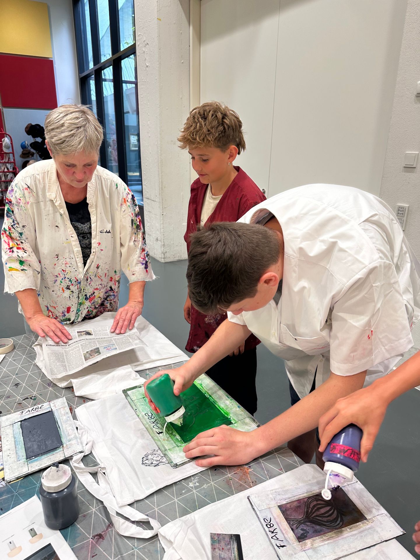 Ein weiterer spannender Teil des Programms war der Workshop, in dem die Schüler die Möglichkeit hatten, T-Shirts oder Taschen zu bedrucken. Unter Anleitung konnten sie ihre eigenen Designs erstellen und ihre Kreativität ausleben. Es war beeindruckend zu sehen, wie viel Spaß die Schüler daran hatten, ihre Ideen in die Tat umzusetzen und stolz ihre selbstgestalteten Produkte mit nach Hause zu nehmen.