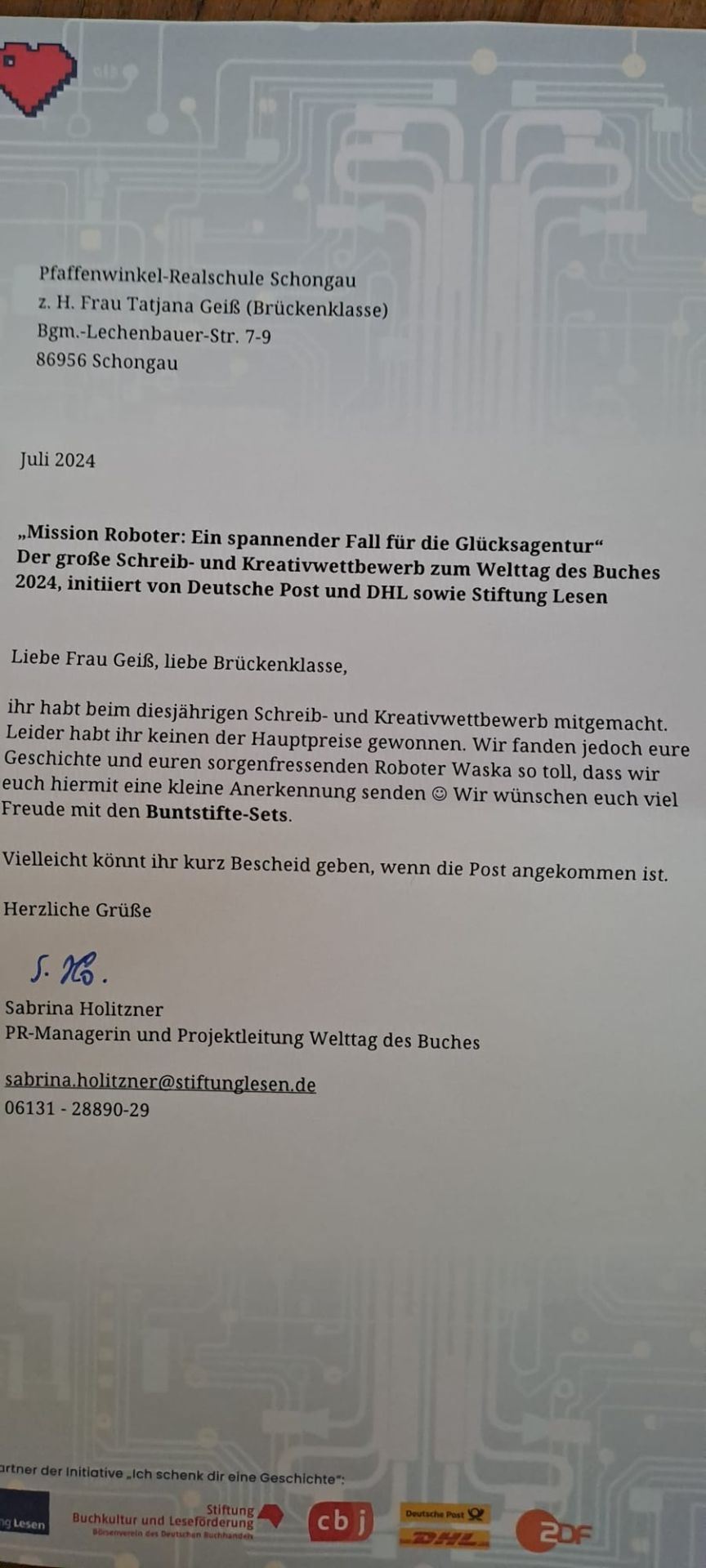 Die Brückenklasse nahm am großen Schreib- und Kreativwettbewerb zum Welttag des Buches 2024 teil und setzte dabei ein spannendes Projekt um. Die Kinder lasen das Buch "Mission Roboter: Ein spannender Fall für die Glücksagentur" und ließen sich davon inspirieren, einen eigenen Roboter zu bauen. Dieser Roboter hatte die besondere Aufgabe, eine Mission als Postbote und Trostspender zu erfüllen.