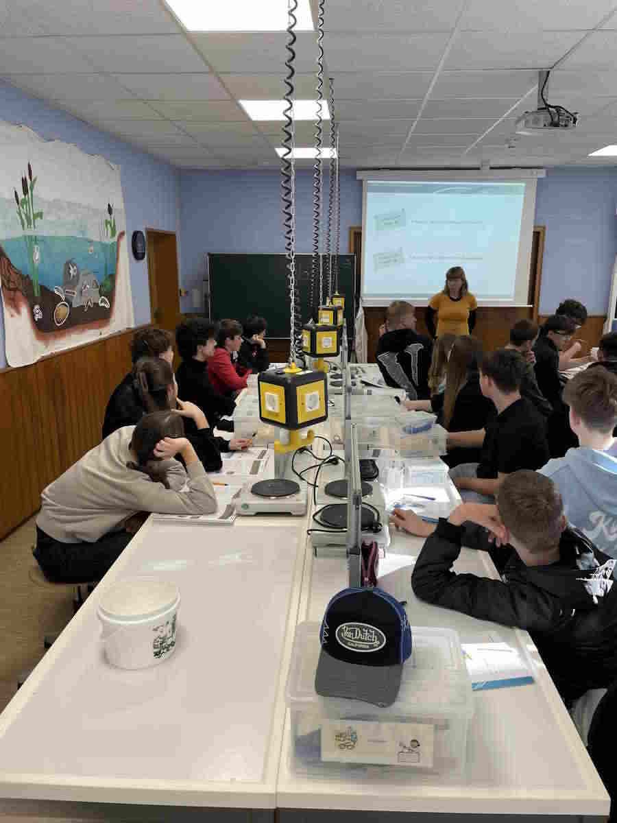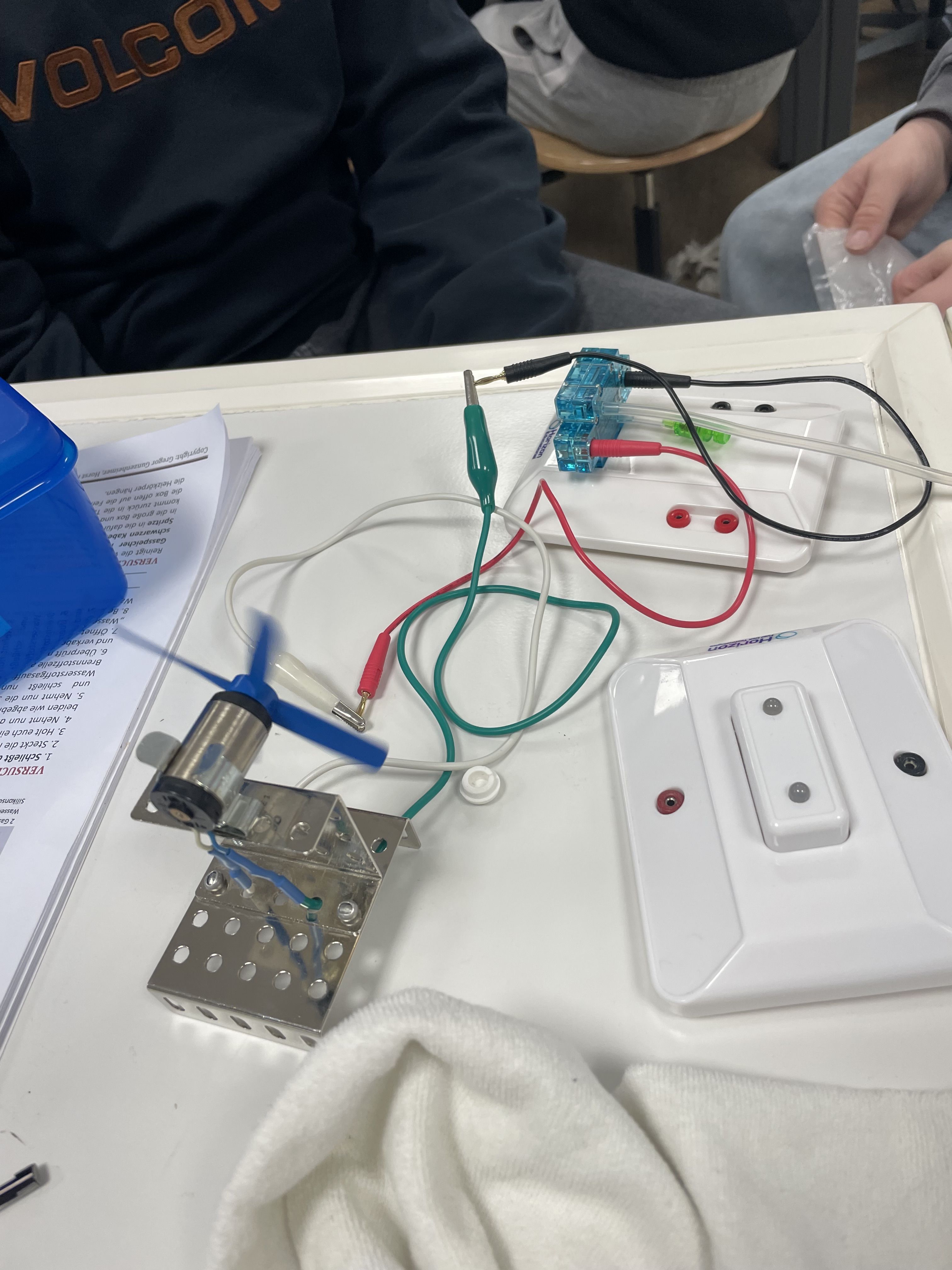 Am Donnerstag haben wir im Labor Wasser mittels Wind- und Solarenergie in Wasser- und Sauerstoff aufgespalten. Den gewonnenen Wasserstoff füllten wir in ein Modellauto, wodurch dieses fahren konnte.