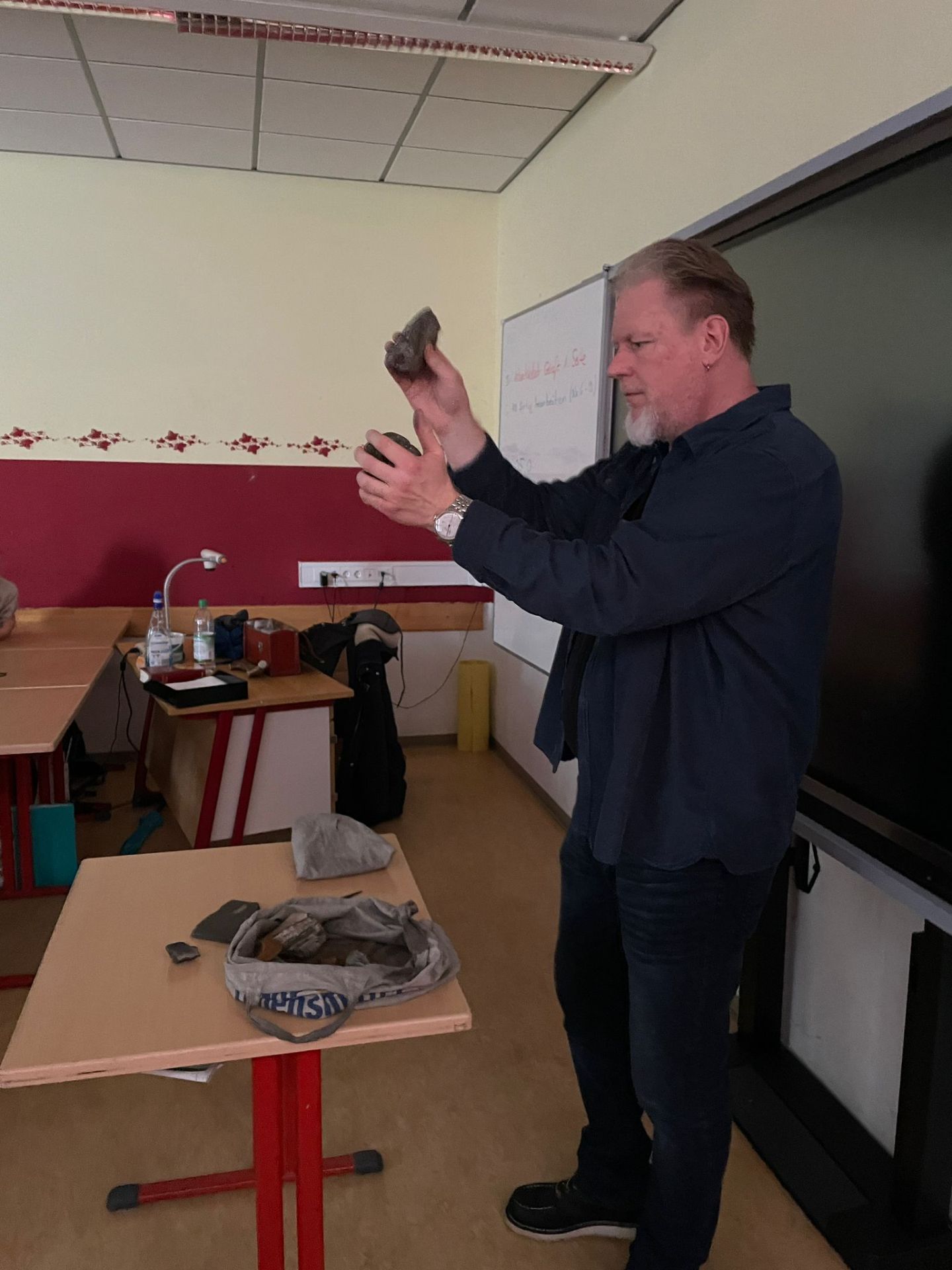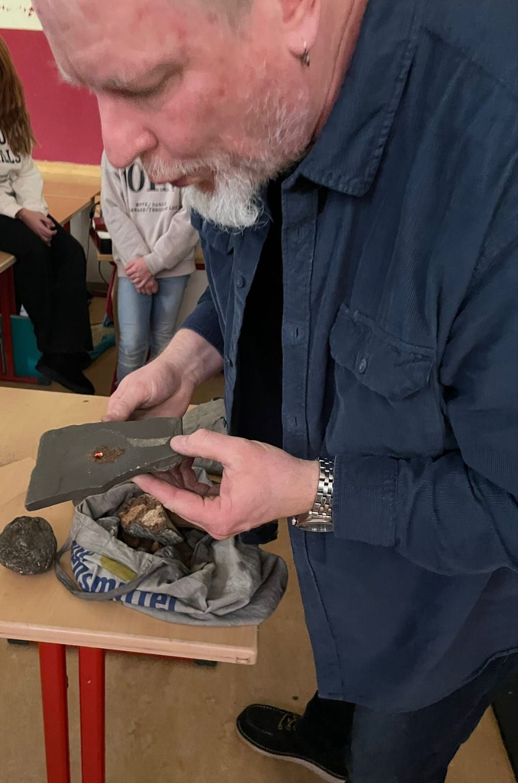 Mit großer Begeisterung nahm Herr Bischler die Schülerinnen und Schüler mit auf eine Reise in die Steinzeit und stellte zugleich die spannende Arbeit eines Archäologen vor. Zum Schluss entfachte er sogar Glut – nur mit Zunder und einem Feuerstein.