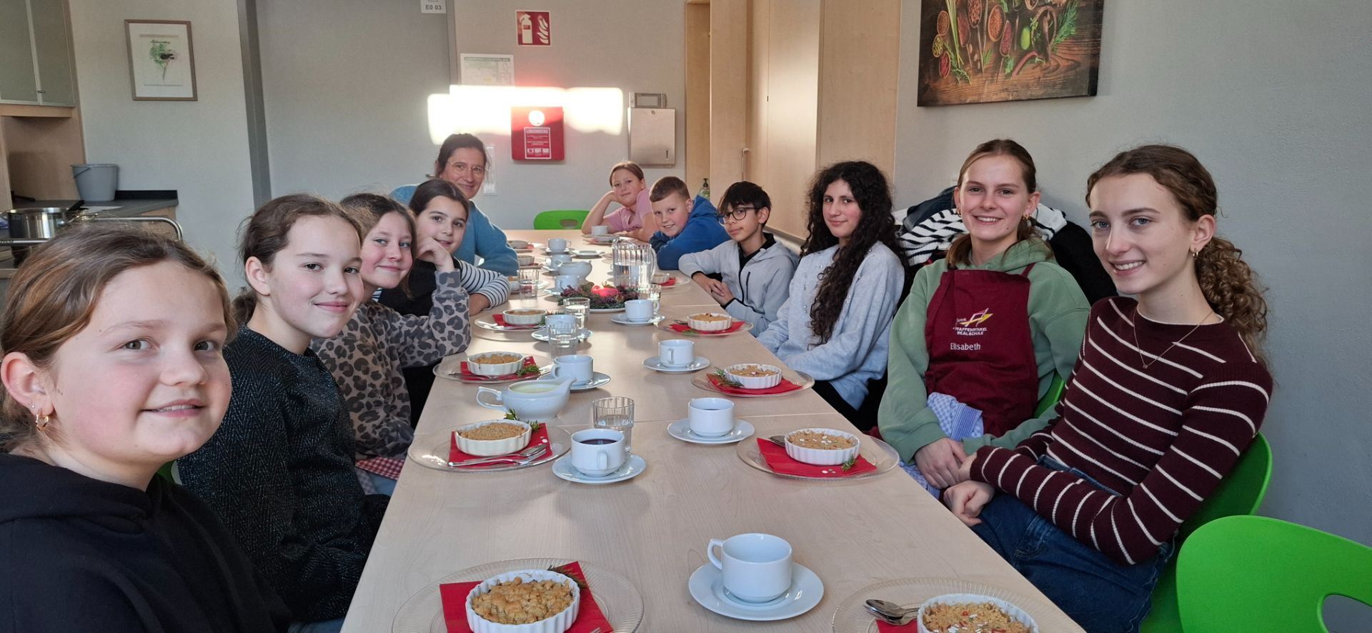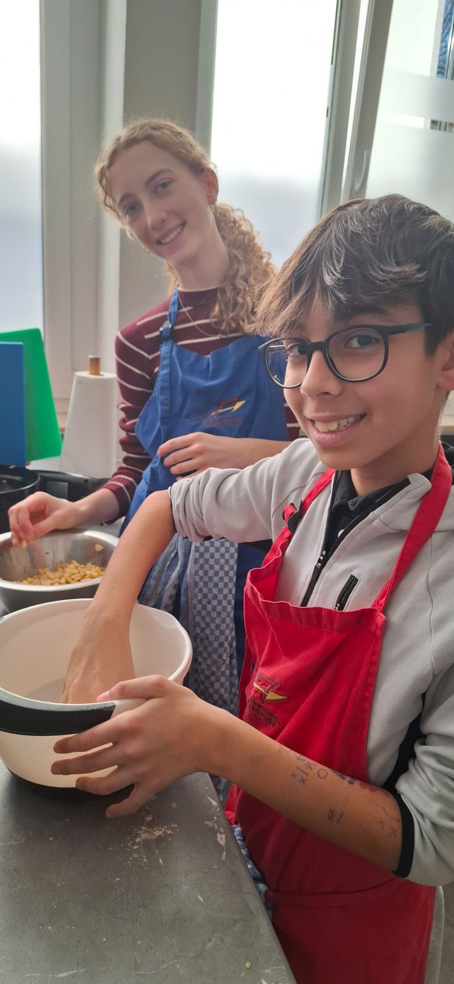 Der Duft von Zimt und Lebkuchen zog an zwei Donnerstagnachmittagen in der Schulküche ein. Die Schülerinnen der Talentklasse, die zum Teil auch als Tutorinnen in der Klasse 5a tätig sind, hatten die Idee, ein gemütliches Adventsbacken zu organisieren. So wurden alle freiwilligen 5.Klässler in zwei Gruppen eingeteilt. Mit fachlicher Unterstützung bereiteten sie einen Apple crumble mit Vanillesoße sowie ein weihnachtliches Schokoladenbrot zu. Beim Schälen, Schneiden, Mischen, Kneten, Rühren, Abwaschen, Backen, Dekorieren und gemeinsamen Essen kam es zu netten Begegnungen und Gesprächen. Es wurde viel gelacht, auch mal genascht, erzählt, sich ausgetauscht und Neues gelernt.