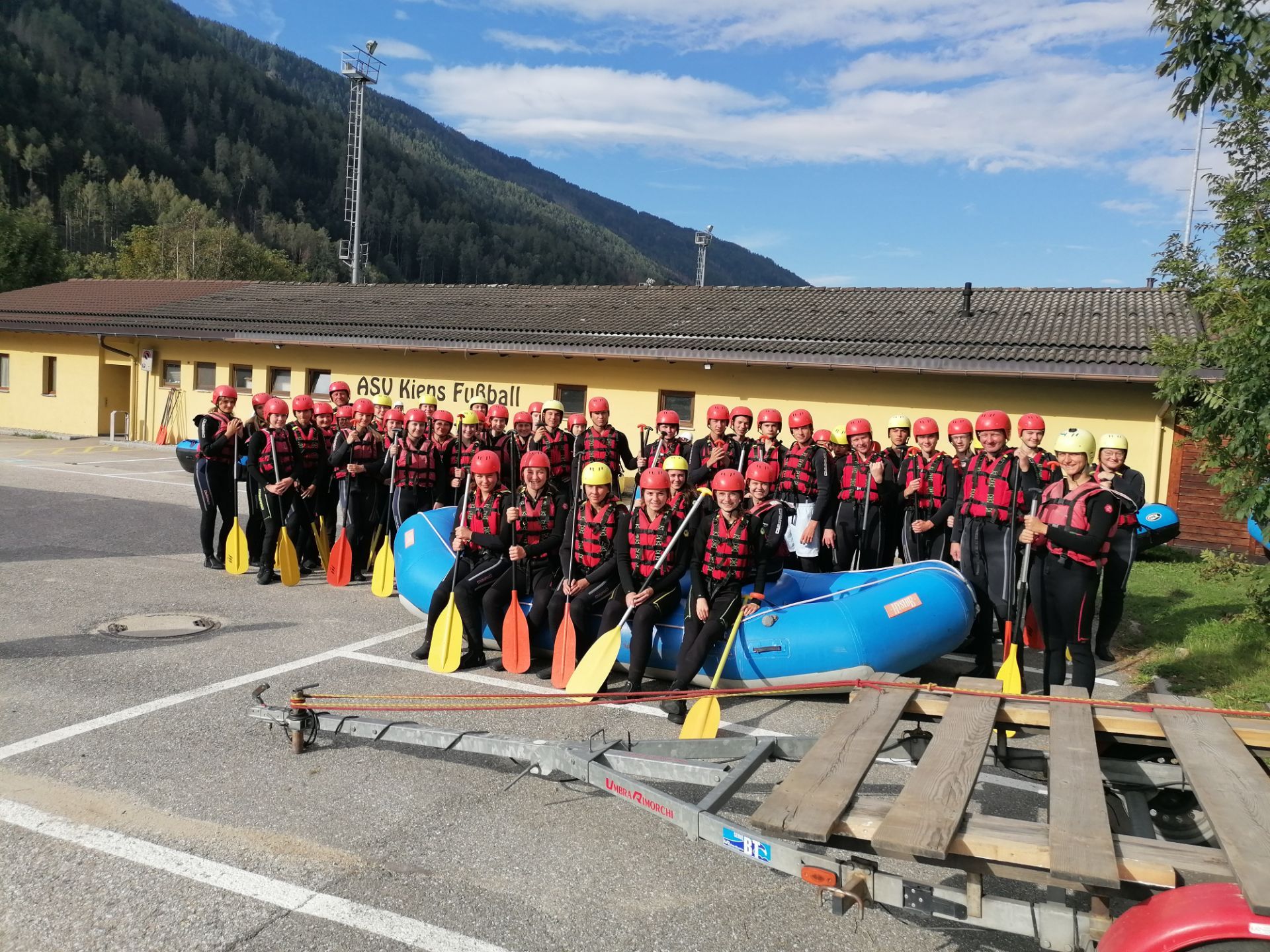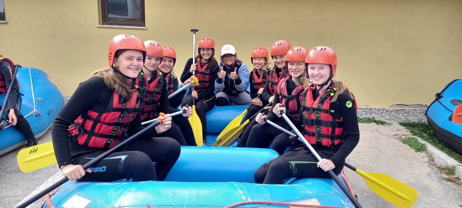 Am Donnerstag ging es für die Klassen 10c und 10 d zuerst zum Rafting, während die Klassen 10a und 10b ihren Tag mit einem Besuch im Kletterwald begannen. Beim Rafting angekommen, wurden zuerst die passenden Neoprenanzüge und Wasserschuhe verteilt und angezogen. Als alle in voller Ausrüstung (Anzüge, Schuhe, Helm, Schwimmweste und Paddel) waren, konnte endlich die Einweisung durchgeführt werden. Nach einem anschließenden Gruppenbild teilten sich alle auf die Boote auf und begaben sich an den Fluss. Nachdem alle startbereit waren, paddelten wir los. Herr Malz war hochmotiviert und erfand gleich am Anfang einen Kampfschrei, welcher sehr oft benutzt wurde. Doch natürlich musste auch noch ein Friedensruf her, welcher ebenfalls oft zu hören war. An einer der wildesten Stellen der Tour durften wir ins Wasser und mit der Strömung ein paar Meter schwimmen. Dabei übermannten uns oft die Wellen und sogar unsere Köpfe wurden unter Wasser gedrückt. Doch es war ein Riesenspaß. Das Wasser war jedoch so kalt, dass diejenigen, die sich hineintrauten oder unfreiwillig hineinfielen, teils Schwierigkeiten hatten im Wasser zu atmen. Wer sich nicht in den kalten Fluss traute, kam jedoch auch nicht trocken aus dem Boot, denn es gab reichlich Wasserschlachten und Gleichgewichtsspiele. Am Ende hatten wir noch die Möglichkeit von einer Brücke zu springen, welche viele nutzten und sogar Tricks machten. Am Ziel angekommen stellten sich alle an einer warmen Steinmauer auf, um sich wieder aufzuwärmen. Anschließend fuhren wir mit dem Bus zurück zu dem Startpunkt unserer Tour, wo sich geduscht, geföhnt und aufgewärmt wurde.
