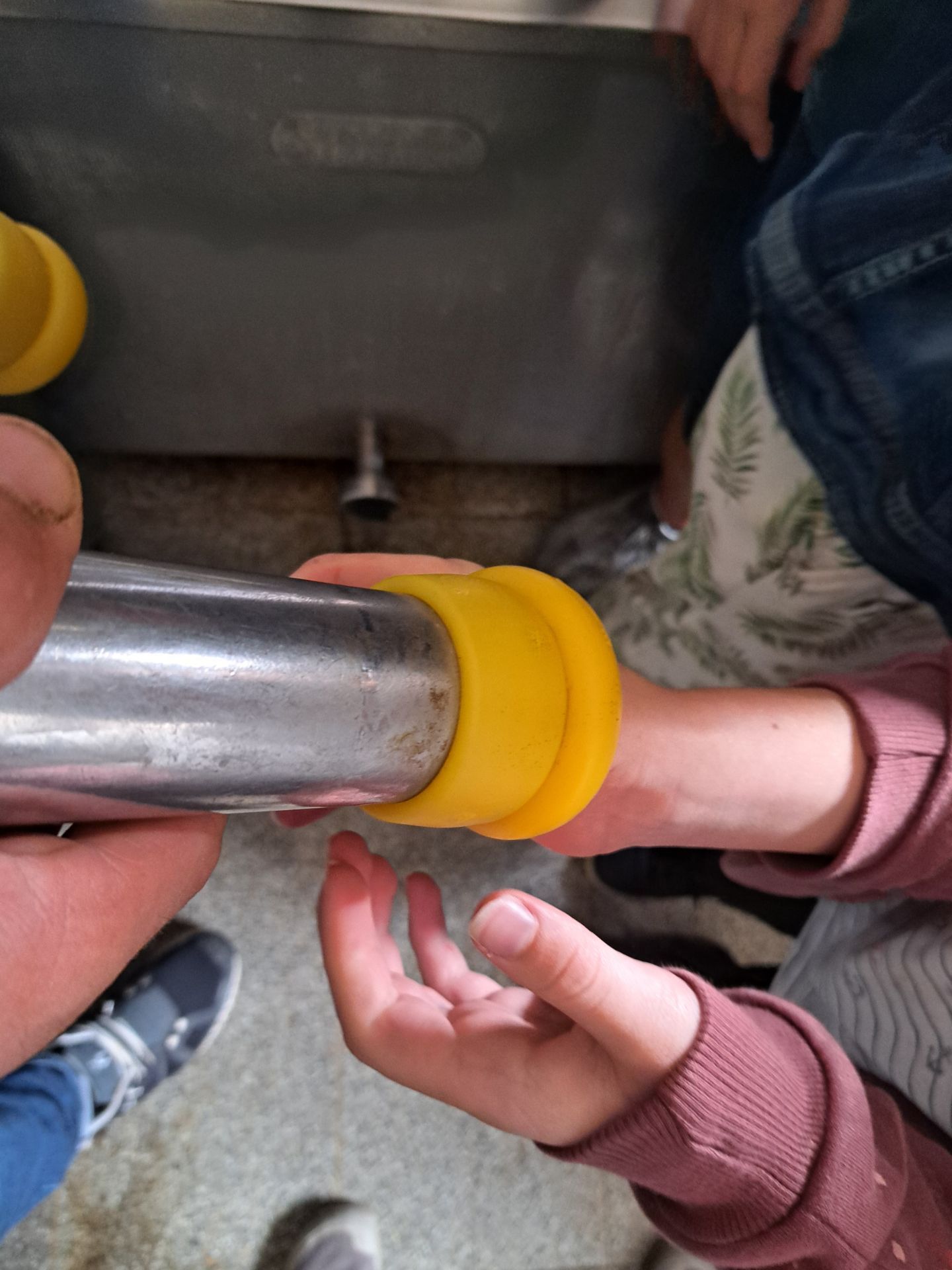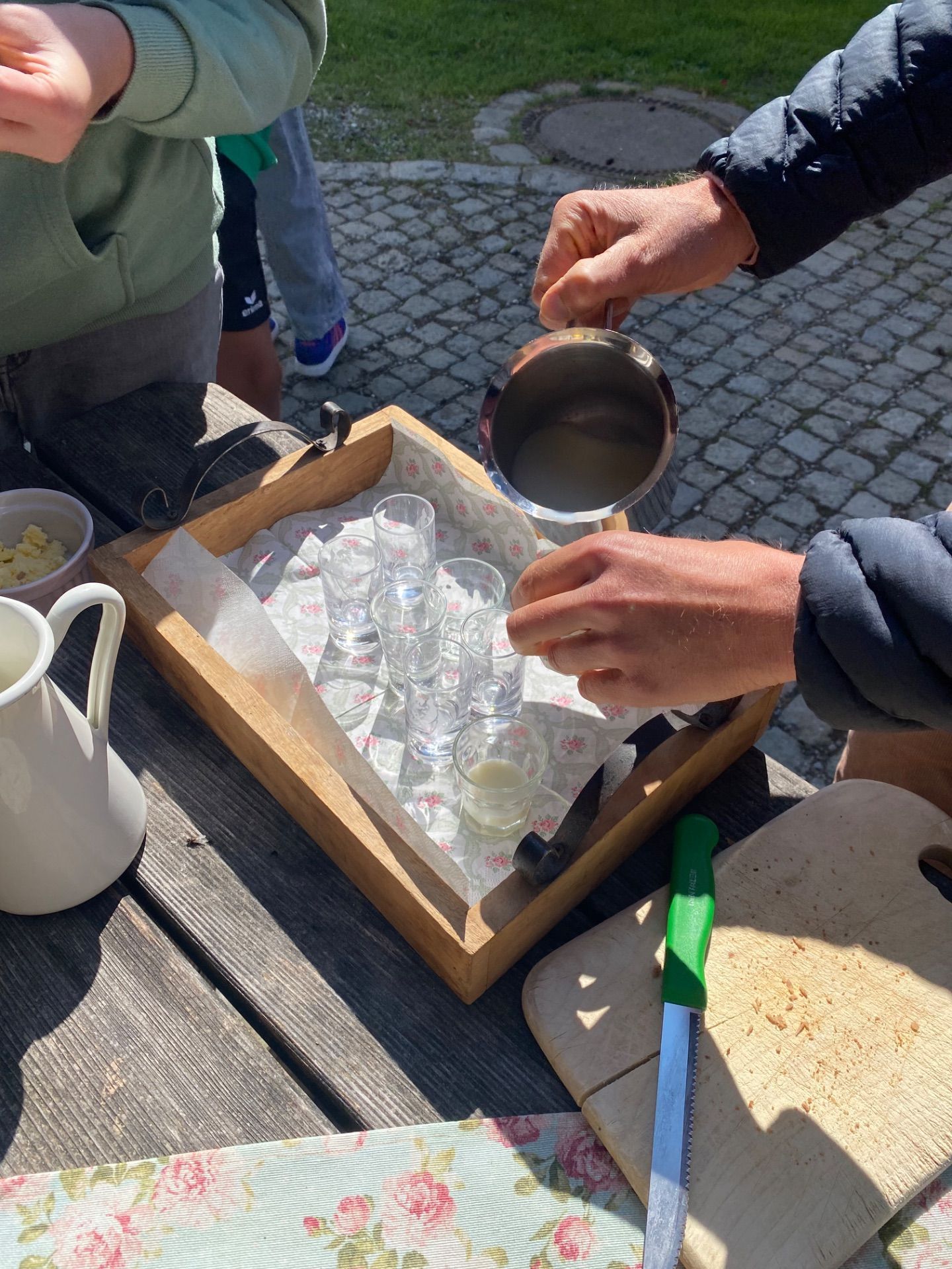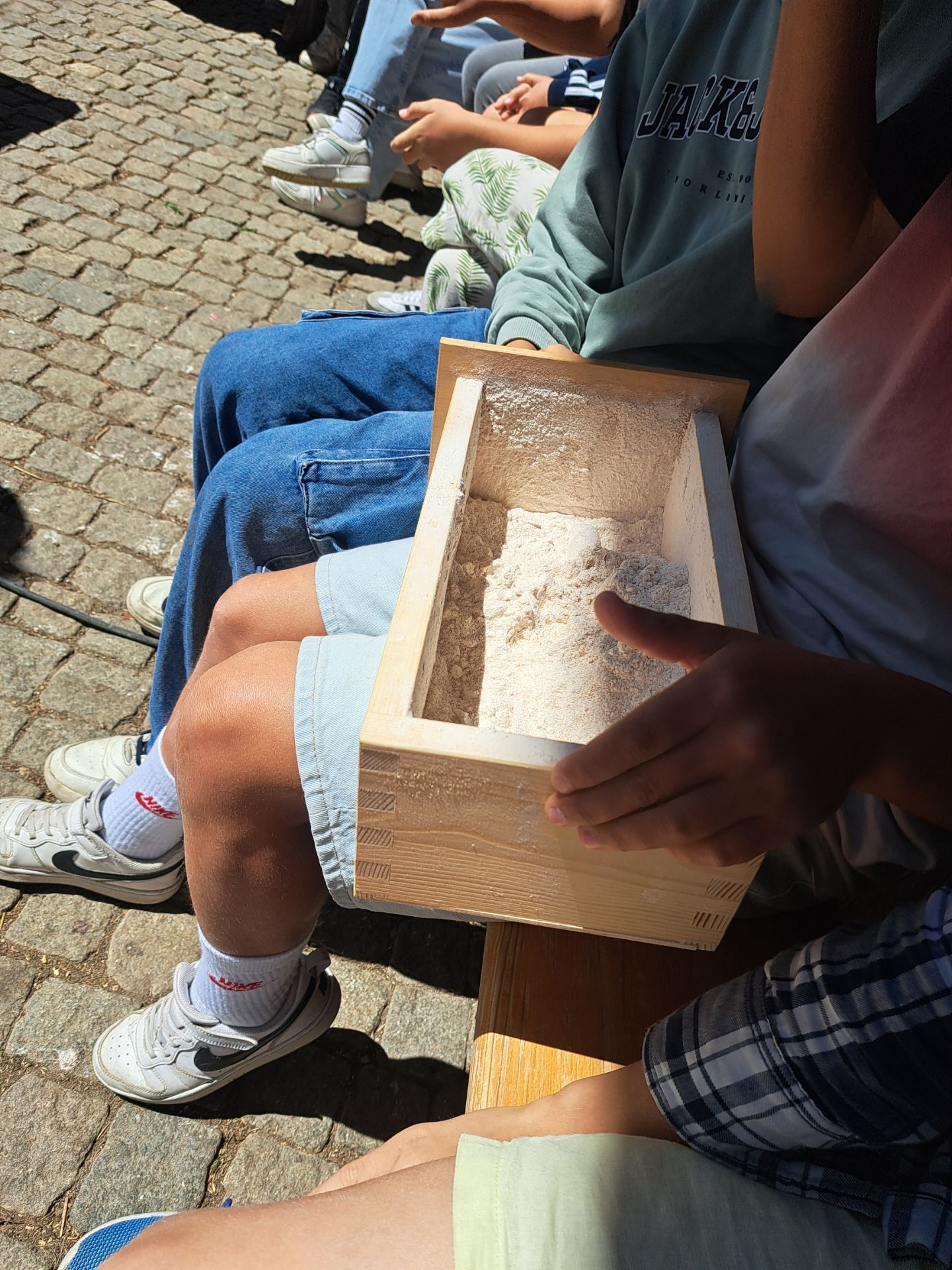 Im zweiten Teil übernahm Antonia und zeigte den Kindern unter anderem ihre Getreidemühle. Hier durften sie selbst miterleben, wie aus Dinkel frisches Mehl gemahlen wird. Beim Vergleich mit gekauftem Mehl wurde der Unterschied schnell klar – sowohl im Geruch als auch im Geschmack. Antonia hat für uns alle Vollkornsemmeln gebacken, die wir testen durften. "Das sind die besten Semmeln, die ich je gegessen habe.", lautete das Urteil eines Schülers. Zum Abschluss wurde aus Sahne noch Butter selbst geschüttelt und anschließend verkostet.
