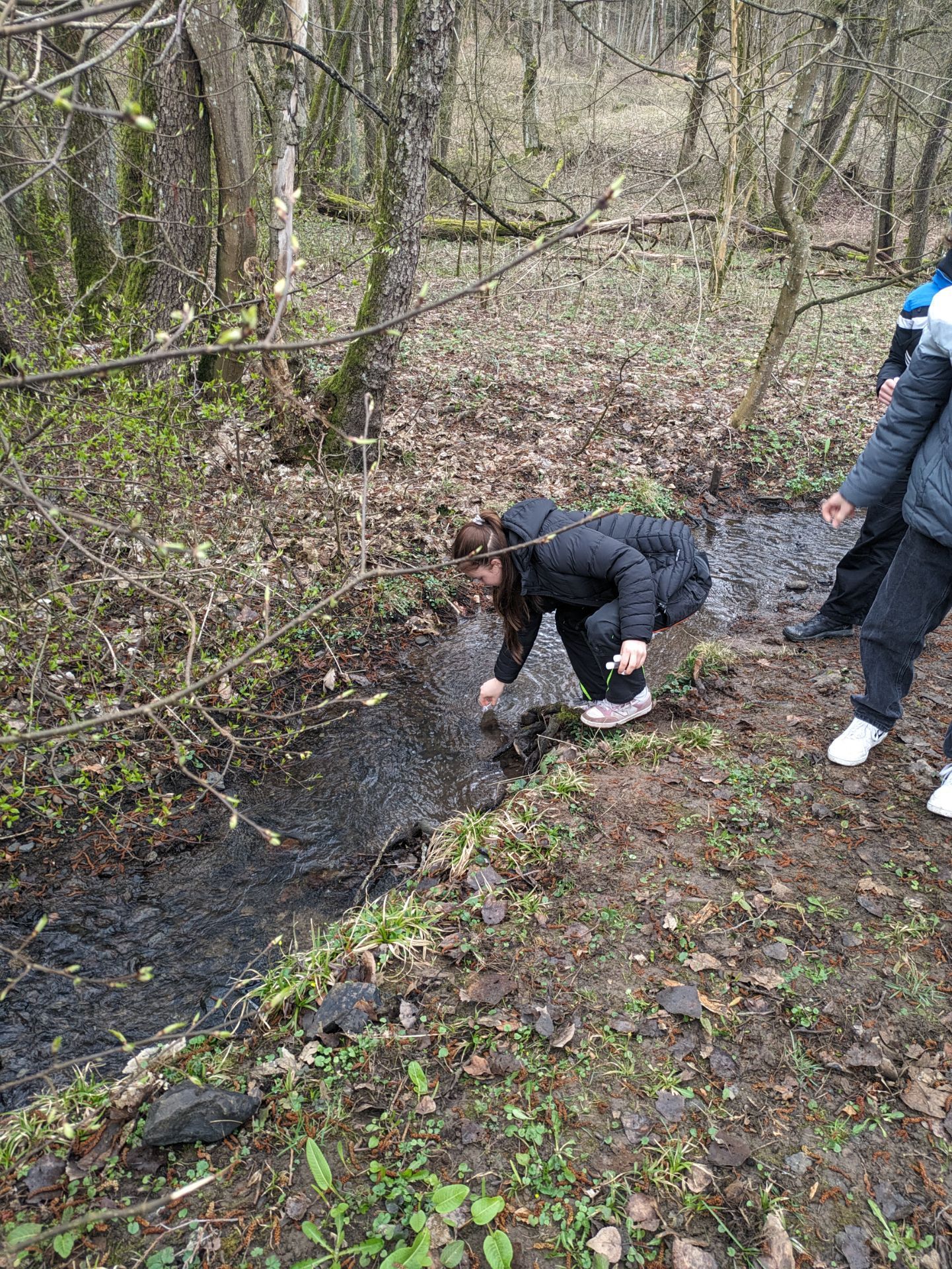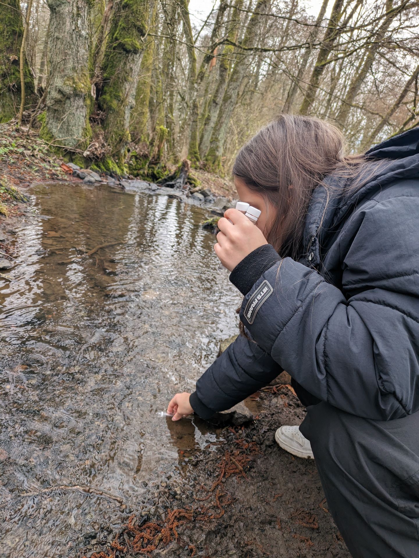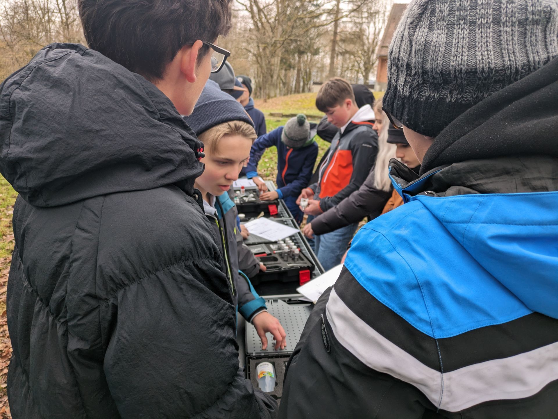 Neben dem Labor, haben wir auch Versuche im Freien unternommen. In Gummistiefeln und mit Keschern bewaffnet machten wir uns auf ins kalte Nass. Wir sammelten verschiedene Tiere wie Flusskrebse ein und ermittelten damit die biologische Wassergüte. Später konnten wir auch mit einem großen Koffer mit Chemikalien hantieren und kamen zum Erfolg. Obwohl dem Bach eine gute Wasserqualität zugewiesen war, wollten wir dennoch nichts davon trinken.