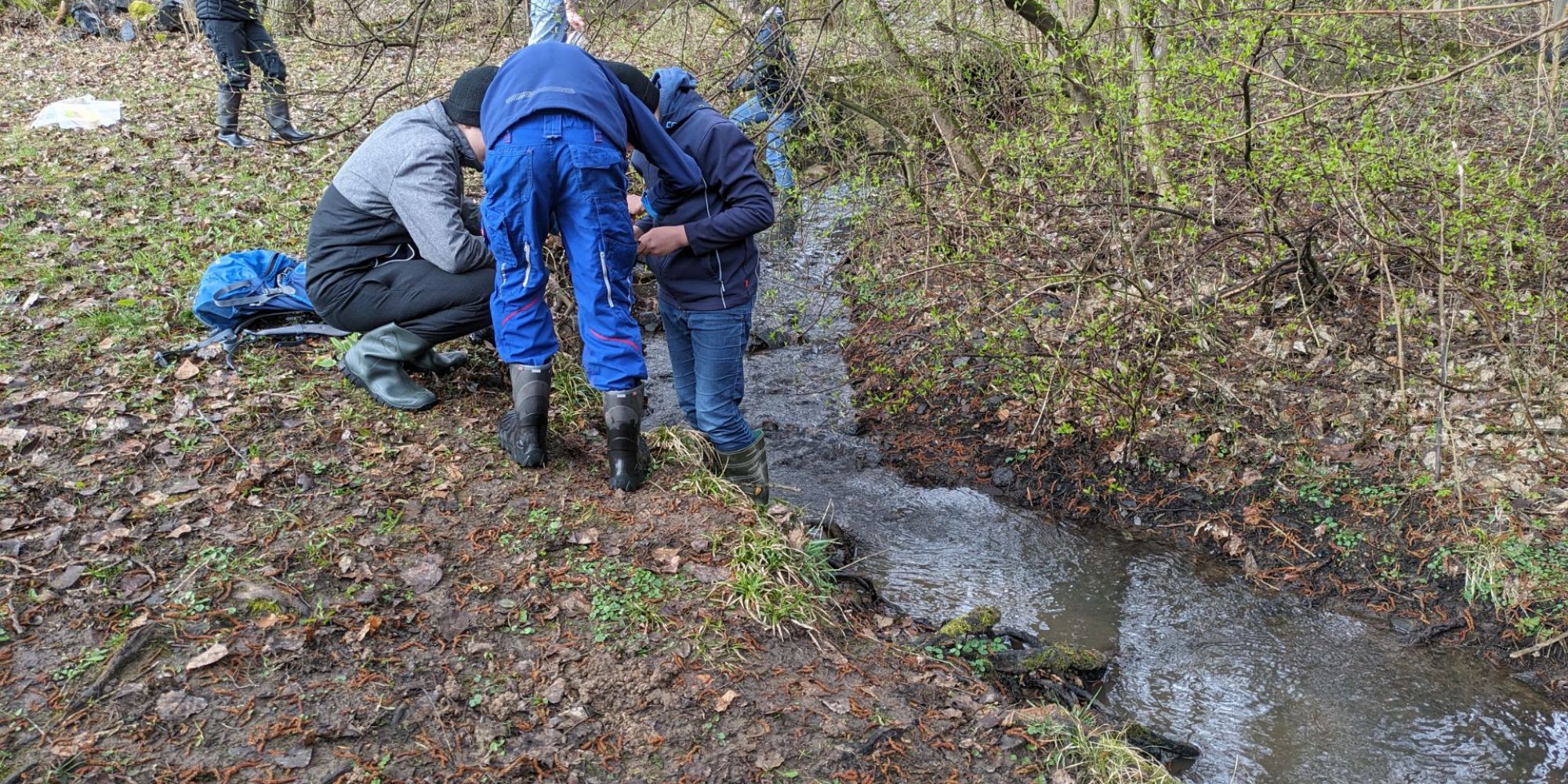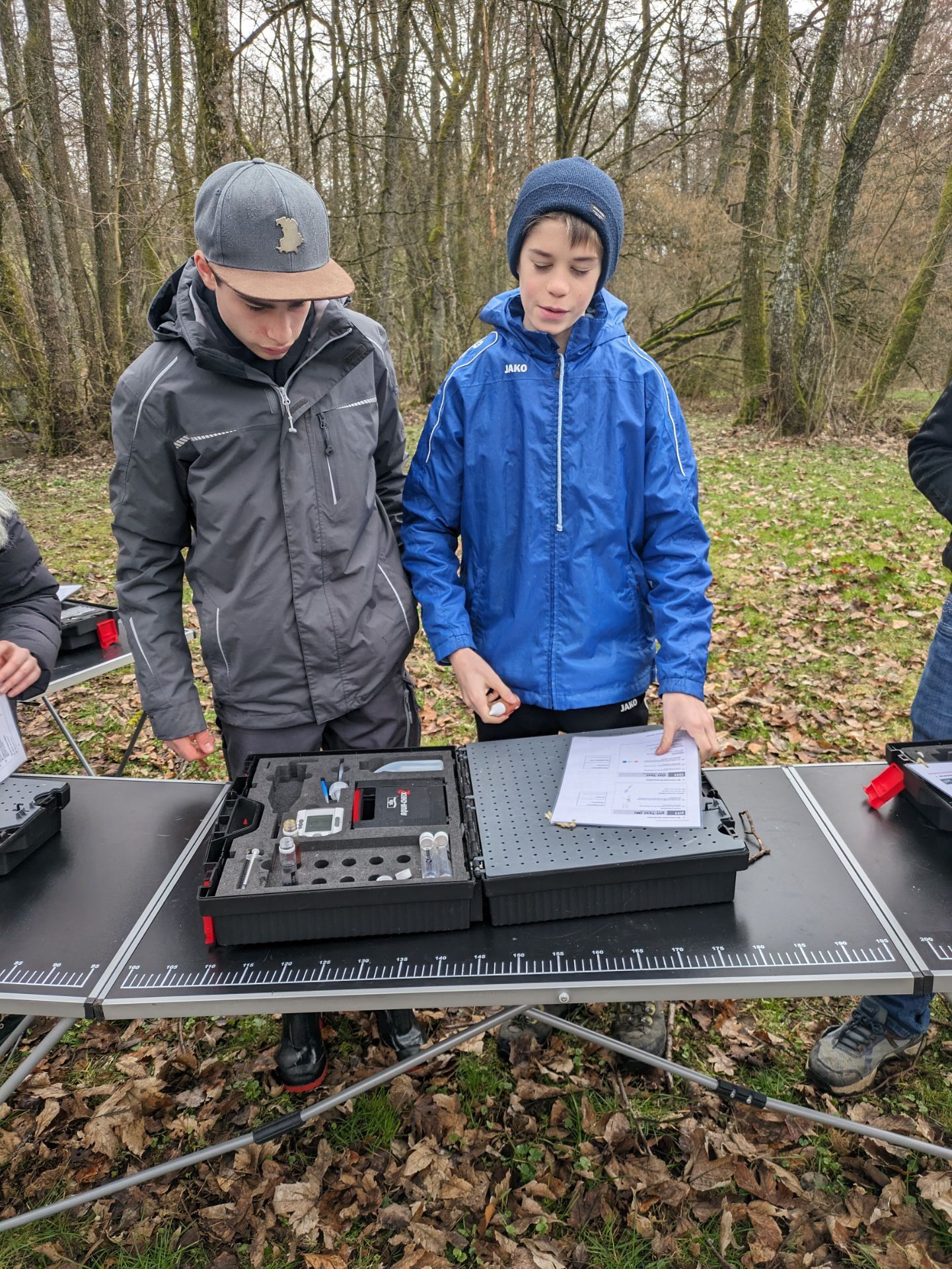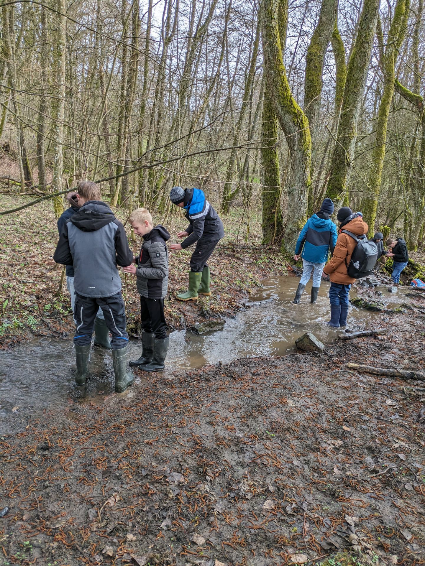 Neben dem Labor, haben wir auch Versuche im Freien unternommen. In Gummistiefeln und mit Keschern bewaffnet machten wir uns auf ins kalte Nass. Wir sammelten verschiedene Tiere wie Flusskrebse ein und ermittelten damit die biologische Wassergüte. Später konnten wir auch mit einem großen Koffer mit Chemikalien hantieren und kamen zum Erfolg. Obwohl dem Bach eine gute Wasserqualität zugewiesen war, wollten wir dennoch nichts davon trinken.