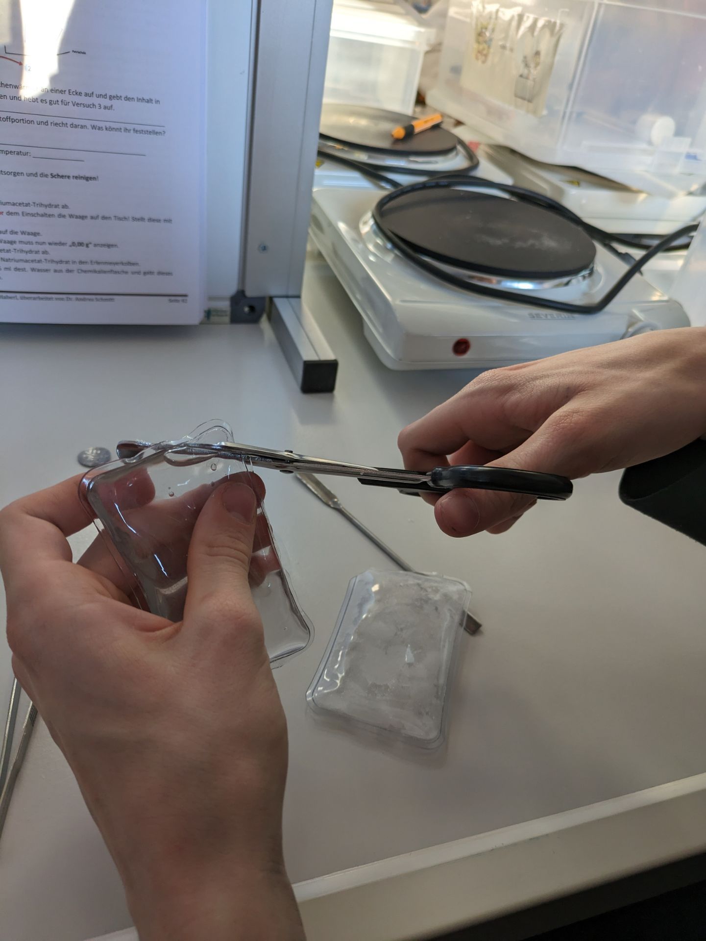 Angekommen im Schullandheim gab es erstmal Nudeln mit Tomatensoße, die zugegeben auch als Suppe gereicht hätte werden können. Wir aber hatten Hunger und haben es brav gegessen. Danach ging es in ein Labor und wir fanden uns in zweier und dreier Gruppen zusammen. Später mussten wir drei tapfere Mädchen in das gegnerische Team – den Weilheimern - übergeben. Trotz großer Sorgen haben sie es überlebt und das Weilheimer Klassengrüppchen auf Trab gebracht.