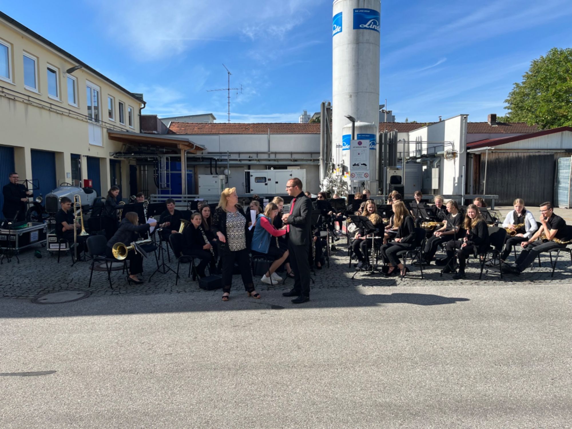 In München durften wir uns auf dem Firmengelände platzieren und warteten dann auf den Jubilar. Zwischenrein kamen immer wieder LKWs um die Ecke und wir mussten alles wegräumen, sonst wäre die LKWs nicht vorbeigekommen.