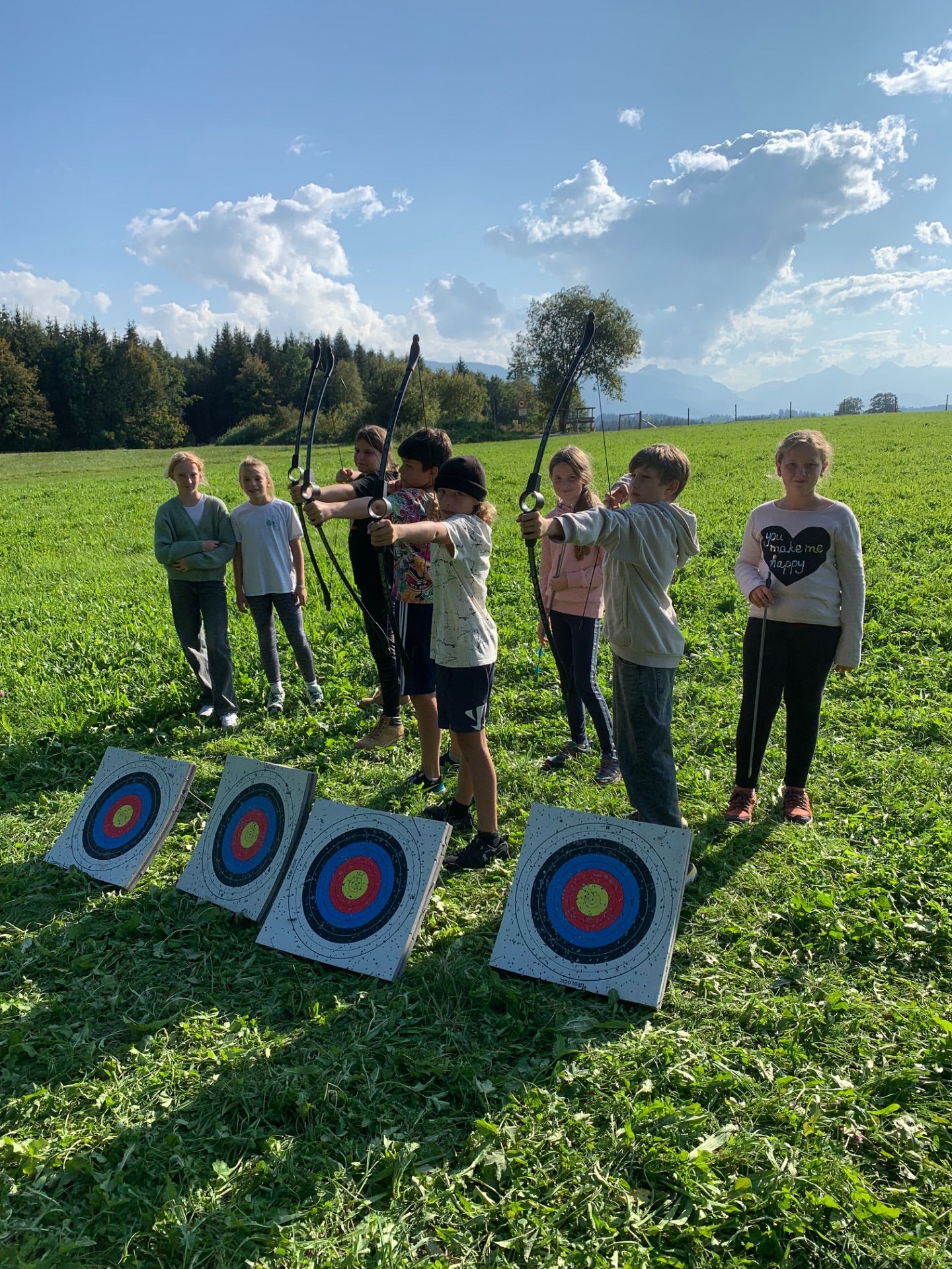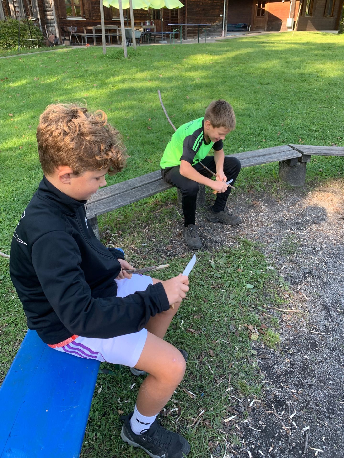 Seit Mittwoch lernt sich die 5b kennen (9 Jungs und 14 Mädchen), spielen Spiele, kaufen zusammen die Verpflegung ein, bereiten gemeinsam die Mahlzeiten zu, springen wagemutig in die Schnitzelgrube und üben sich im Klettern, Bogenschießen und Schnitzen.