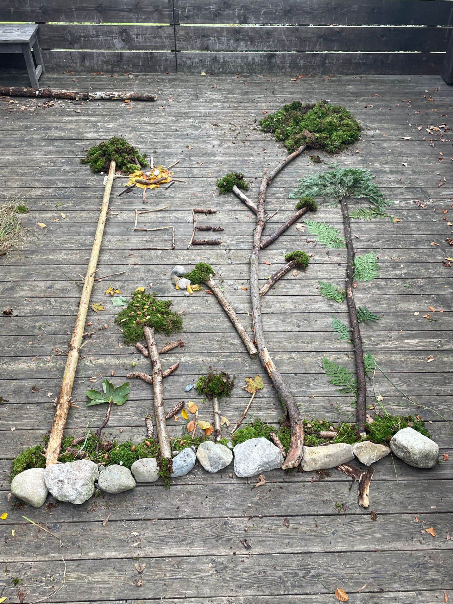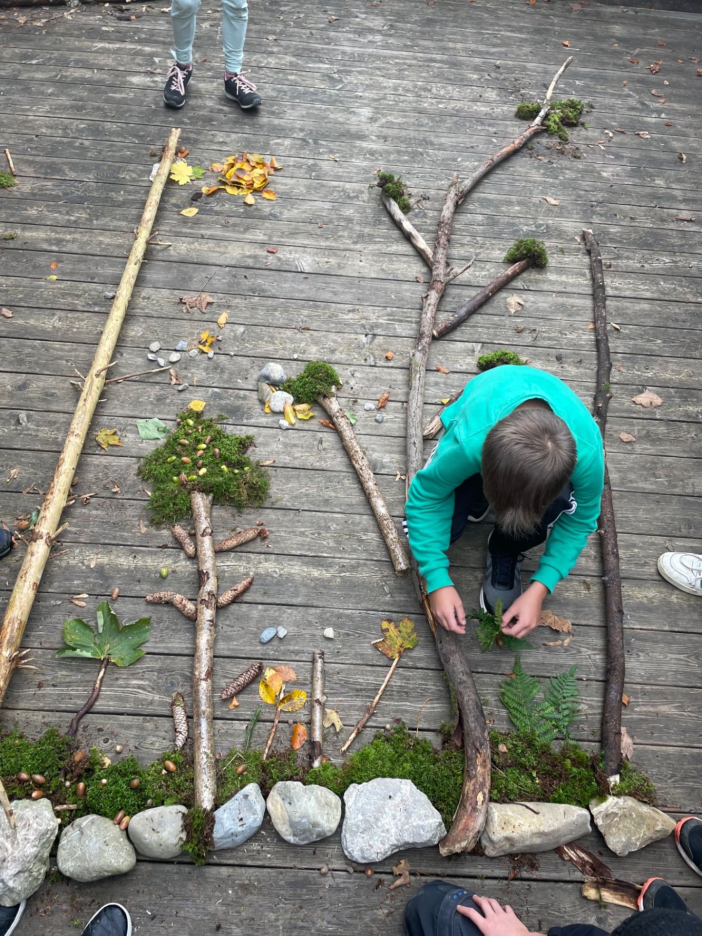 Neben Aktivitäten zur Förderung der Klassengemeinschaft gab es für die Kinder aber in den Regenpausen auch immer wieder die Möglichkeit, sich mit der Natur zu verbinden und die Ruhe des Waldes zu genießen. So wurden die Schülerinnen und Schüler zum Beispiel losgeschickt, um bestimmte Naturmaterialien zu suchen. Anschließend durfte die Klasse gemeinsam ein großes Naturmandala legen.