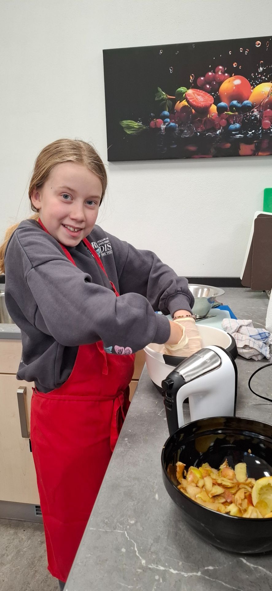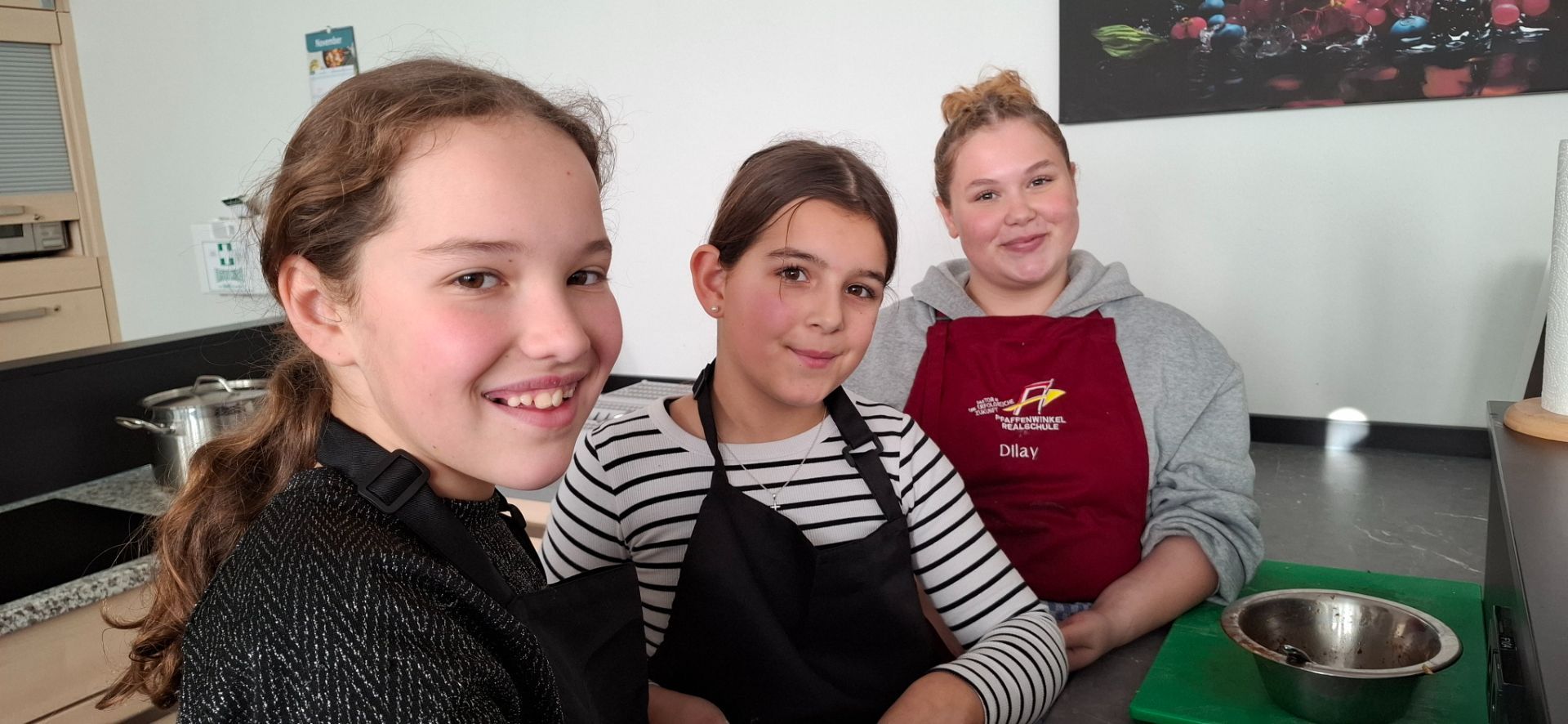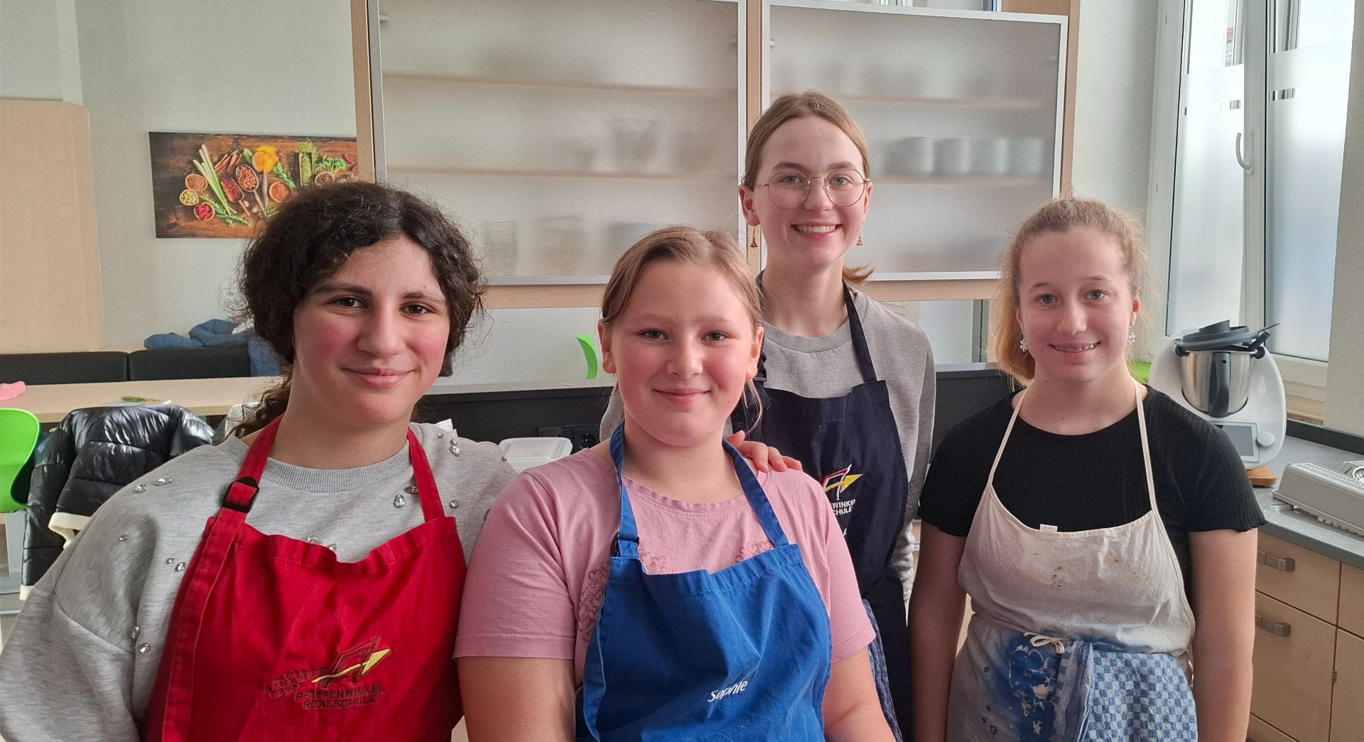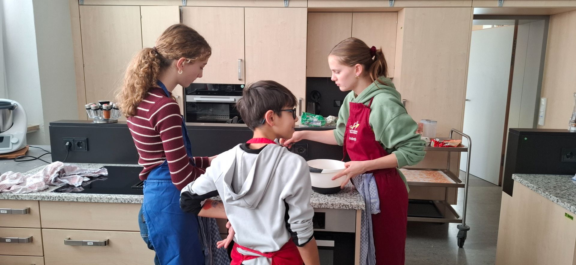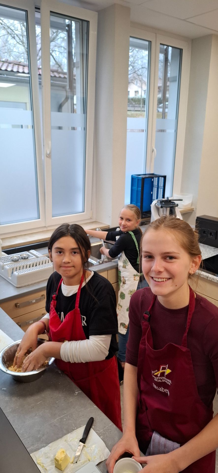 Der Duft von Zimt und Lebkuchen zog an zwei Donnerstagnachmittagen in der Schulküche ein. Die Schülerinnen der Talentklasse, die zum Teil auch als Tutorinnen in der Klasse 5a tätig sind, hatten die Idee, ein gemütliches Adventsbacken zu organisieren. So wurden alle freiwilligen 5.Klässler in zwei Gruppen eingeteilt. Mit fachlicher Unterstützung bereiteten sie einen Apple crumble mit Vanillesoße sowie ein weihnachtliches Schokoladenbrot zu. Beim Schälen, Schneiden, Mischen, Kneten, Rühren, Abwaschen, Backen, Dekorieren und gemeinsamen Essen kam es zu netten Begegnungen und Gesprächen. Es wurde viel gelacht, auch mal genascht, erzählt, sich ausgetauscht und Neues gelernt.