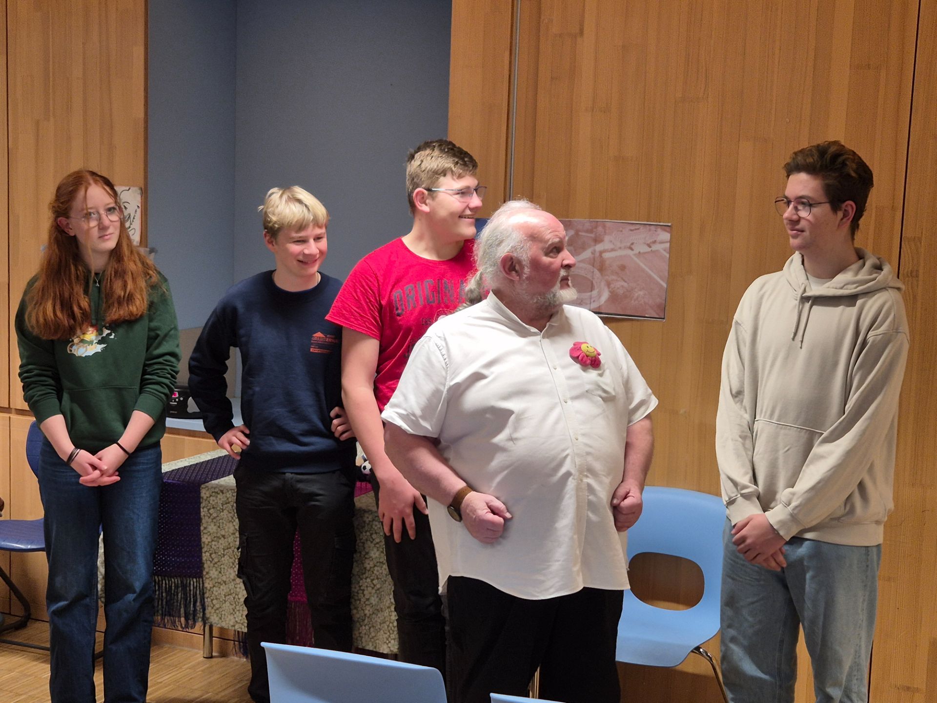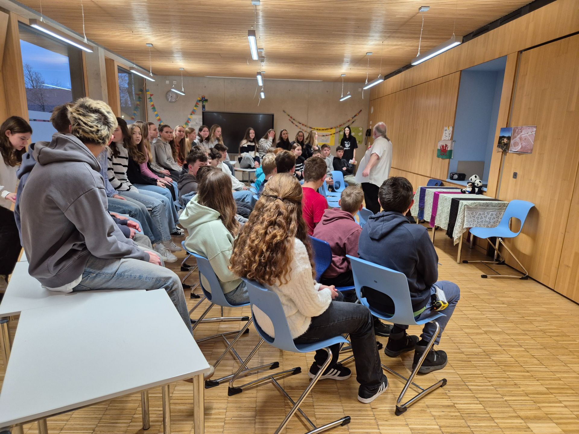 SAME PROCEDURE AS EVERY YEAR – so könnte die Tradition bezeichnet werden, die sich unsere Schule in den letzten Jahren aufgebaut hat und die die Schüler/-innen jedes Jahr aufs Neue begeistert und ihre Englischkenntnisse auf lebendige Weise fördert: Der Besuch des Geschichtenerzählers Jim Wingate aus Wales. Einmal im Jahr kommt der gebürtige Schotte an die Schule, um unseren Schüler/-innen englische Geschichten zu erzählen und sie aktiv in die Stücke mit einzubeziehen. Dieser Besuch ist nicht nur eine willkommene Abwechslung zum regulären Unterricht, sondern bietet den Schüler/-innen die einzigartige Möglichkeit, Englisch auf eine spielerische Weise zu erleben. Besonders wertvoll ist die Möglichkeit, die Geschichten aus der Perspektive eines Muttersprachlers zu hören. Der Besuch des Geschichtenerzählers Jim hat sich fest in den Jahreskalender der Schule integriert und wird sowohl von den Schüler/-innen als auch von den Lehrkräften mit großer Vorfreude erwartet. Eine Neuerung in diesem Jahr war, dass zum ersten Mal auch eine 9. und eine 10. Klasse an den Geschichten teilnehmen durften. Bisher galt dieses ‚,Theater‘‘ nur den 5. und 6. Klassen, da die Themen für dieses Alter ansprechender und die Sprache dem Lernniveau angepasster ist. Auch wenn die Motivation hier vielleicht eine andere war, hatten dennoch auch die Großen ihren Spaß daran. 😊